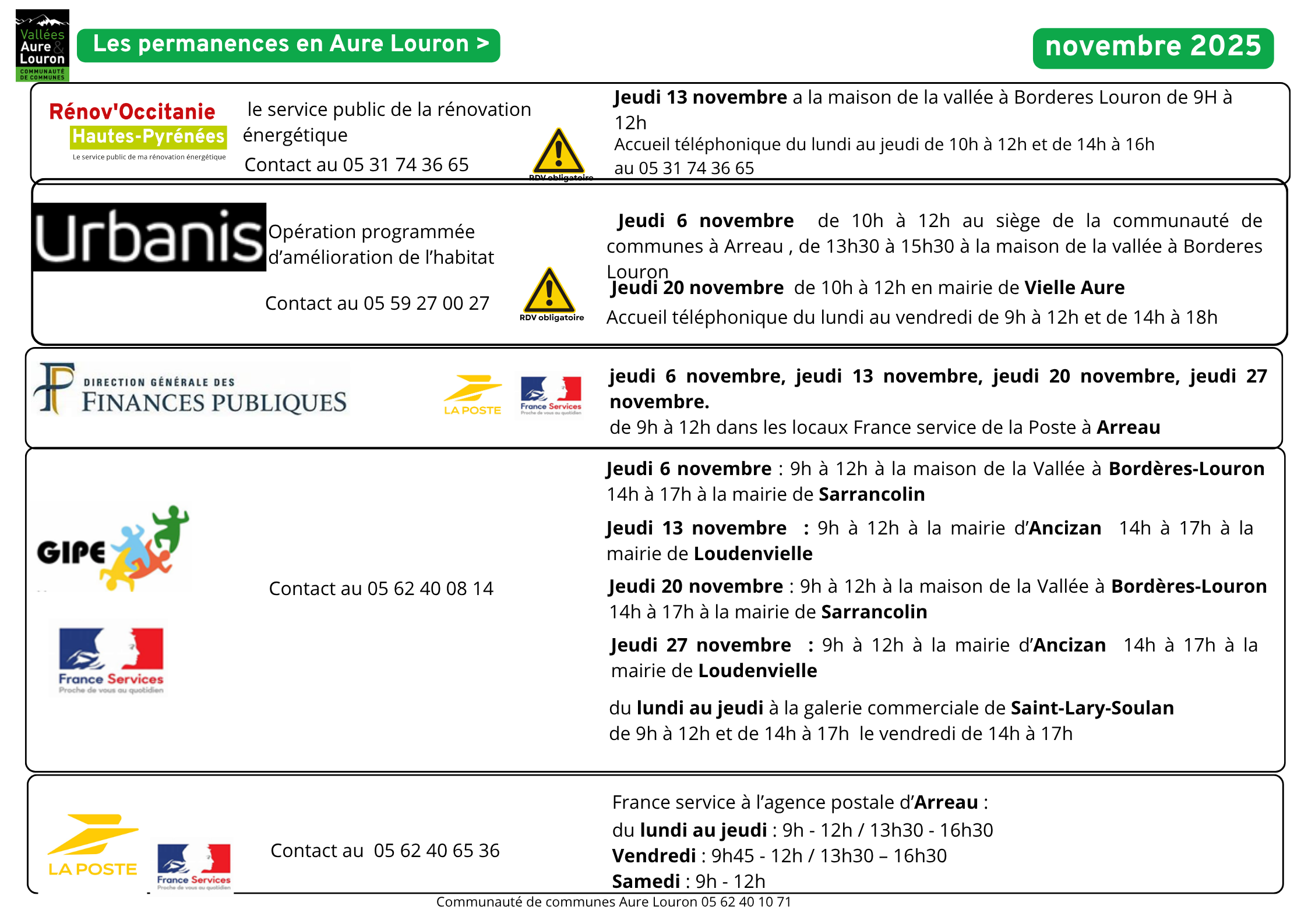 Les permanences en Novembre 2025 : DDFIP, Renov'Occitanie, OPAH, France Services, Maison du travail saisonnier, CIDDF, Mission Locale, Accompagnement social